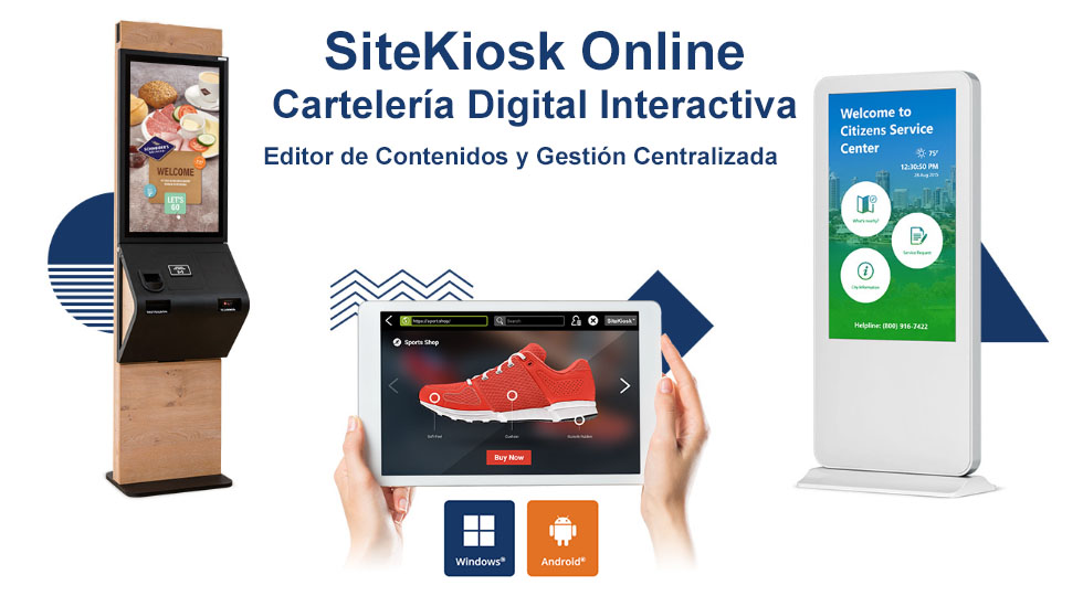 SiteKiosk Online ofrece un sistema de gestión de contenidos fácil de usar para crear pantallas interactivas tanto en dispositivos Windows y Android, incluyendo tabletas, kioscos y PCs. Ideal para señalización digital, sistemas POS, terminales de autoservicio, pantallas publicitarias, terminales de RRHH para empleados y pantallas informativas.