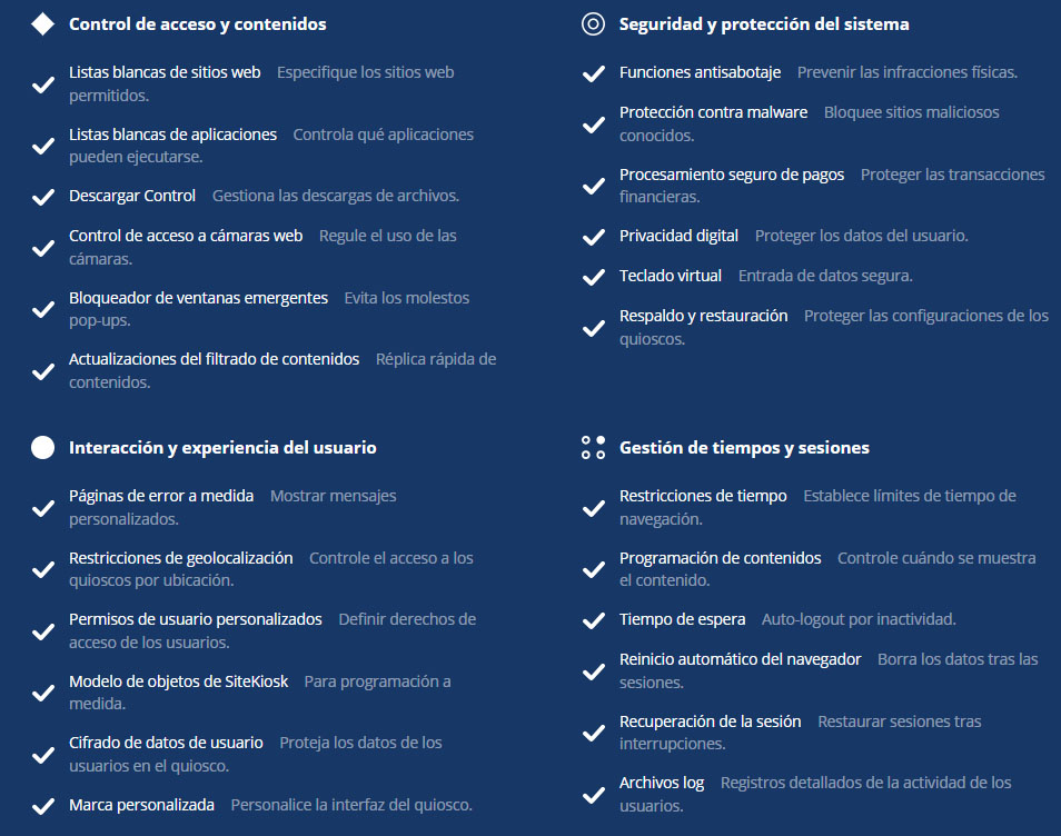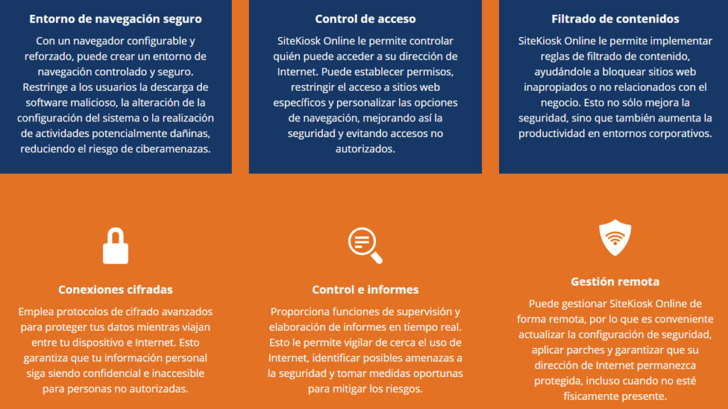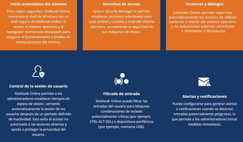 SiteKiosk Online pone un enfoque primordial en la seguridad del sistema, proporcionando a las organizaciones un conjunto robusto y completo de herramientas para salvaguardar sus dispositivos digitales y Kioscos.